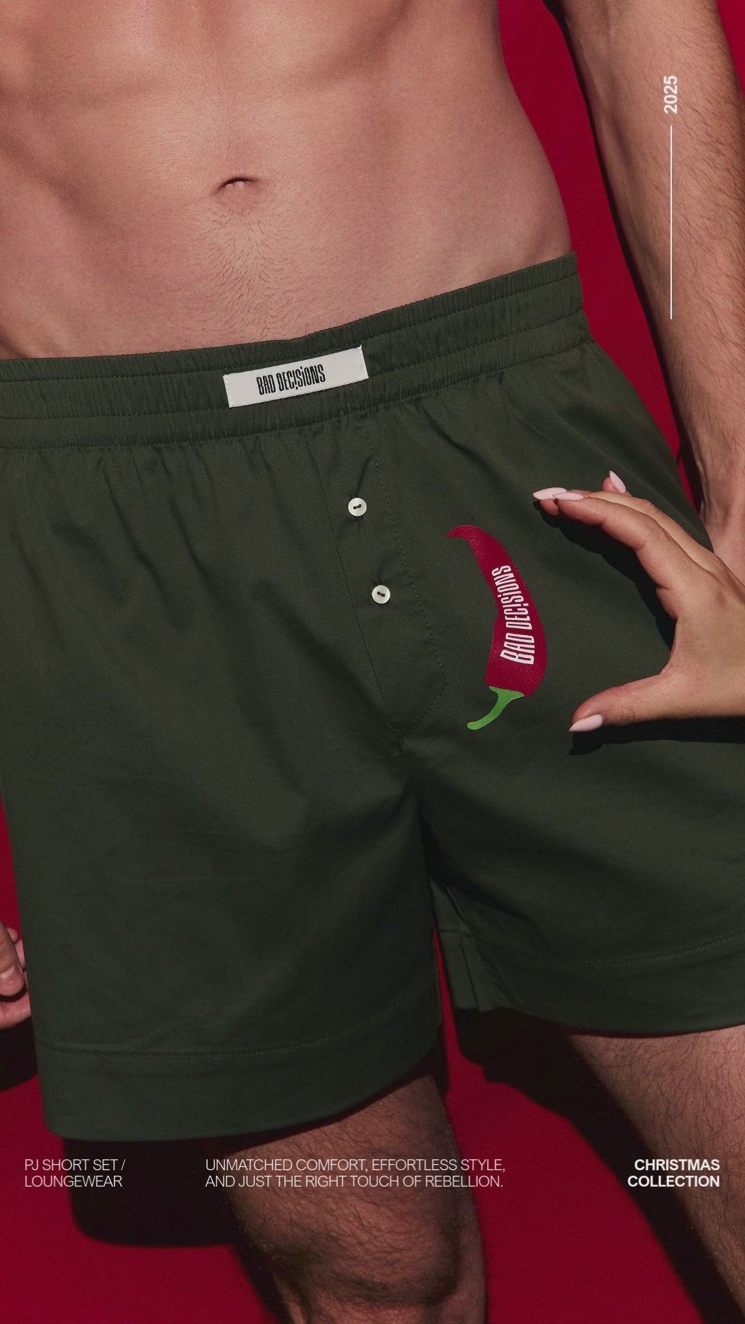A limited edition men’s cotton boxer shorts. The pair comes in a solid khaki tone, accented with the „Bad Decisions“ mini symbol – a chili pepper. These boxers are for those who aren’t afraid to make bold and sometimes the bad decisions — because those often turn out to be the best.